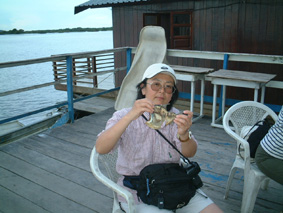アマゾン川でピラニアに舌鼓(ブラジル、マナウス)eating a piranha on the Amazon/ 2003.6